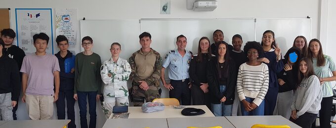 Le mardi 16 septembre 2025 trois militaires de la 2e compagnie du 27e BCA sont venus rencontrer les élèves de la classe défense. Pendant deux heures, le lieutenant Nicolas, le sergent Maxime et le soldat de 1ère classe Kheila ont présenté l'histoire des chasseurs alpins depuis la fin du XIXe siècle puis une discussion franche s'est engagée sur le métier de militaire, la place des femmes dans l'armée, les opérations extérieures, la compatibilité entre la vie militaire et la vie de famille, etc.Enfin les élèves ont pu essayer du matériel apportés par les militaires ce qui leur a permis de se rendre compte de la réalité du métier de soldat. Cette rencontre est un moment fort de l'année pour les élèves de la classe défense qui auront encore la possibilité d'échanger avec des militaires mais cette fois à la caserne Tom Morel.